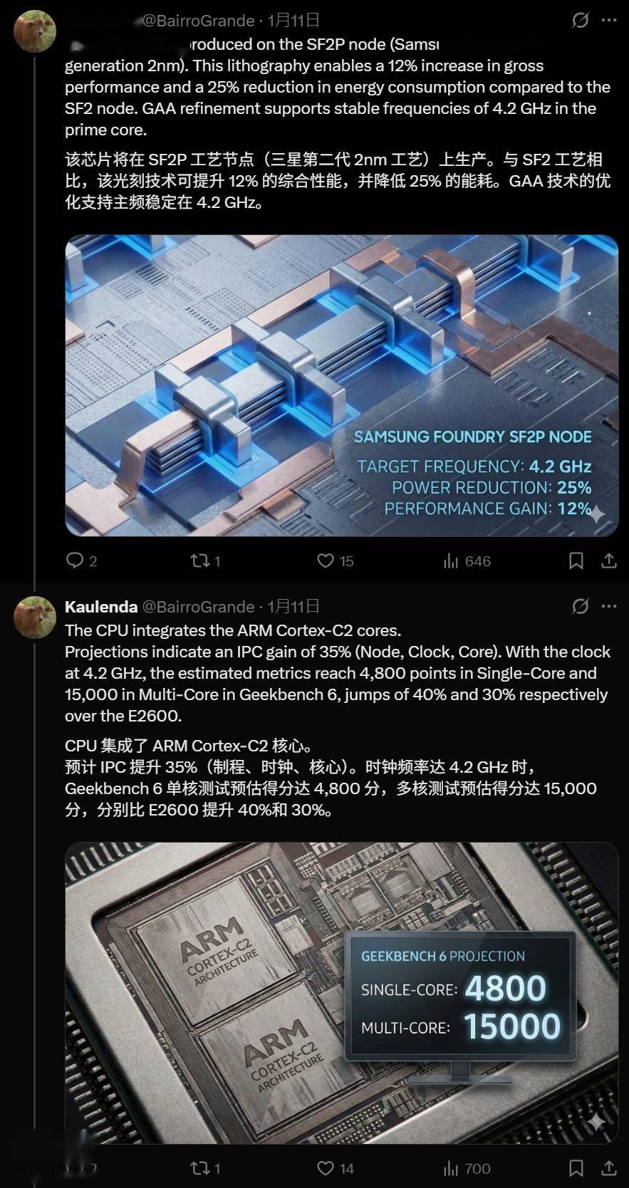 据介绍,这款芯片将使用三星自家的第二代 2nm 制程工艺(SF2P),相比 SF2 工艺综合性能可提升 12%,整体能耗降低 25%,主频稳定在 4.2GHz,CPU 部分集成 Arm Cortex-C2 核心,有望延续 Exynos 2600 的 1+3+6 核心,IPC(每周期指令)性能有望提升 35%。