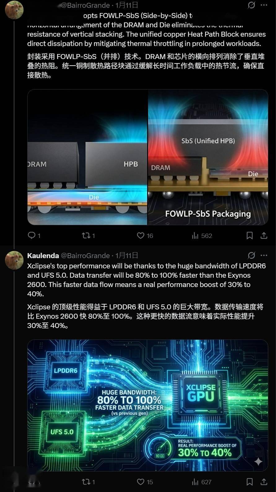设计方面,这款新品预计将采用 FOWLP-Sbs 先进封装技术,让 SoC 与 DRAM 并排放置,上层则覆盖 HPB(IT之家注:铜基散热块),有利于扩大 SoC Die 和 HPB 的接触面积,消除普通封装、垂直堆叠的热阻现象,进一步增强散热效能。