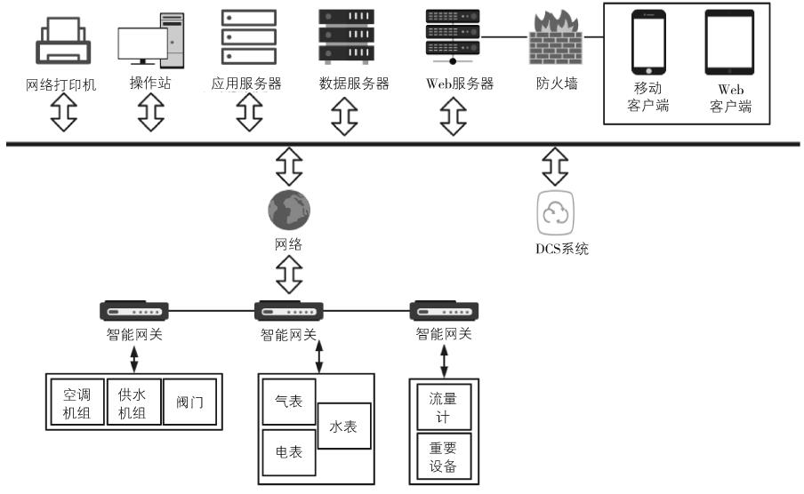 综合智慧能源管理系统的总体设计如图1所示。首先,该系统的设计可以支持多种工业接口的应用,如PLC接口、智能仪表接口以及在线分析仪接口、PDA接口、智能传感器接口等。其次,该系统设计支持西门子Profinet通信协议等所有的通信协议。此外,还可以根据实际需求和网络的情况,实现有限组网模式、有线和无线的混合组网模式、无线组网模式等多种类型。最后,能够实现对能源的能耗数据进行采集、分析和优化控制管理。