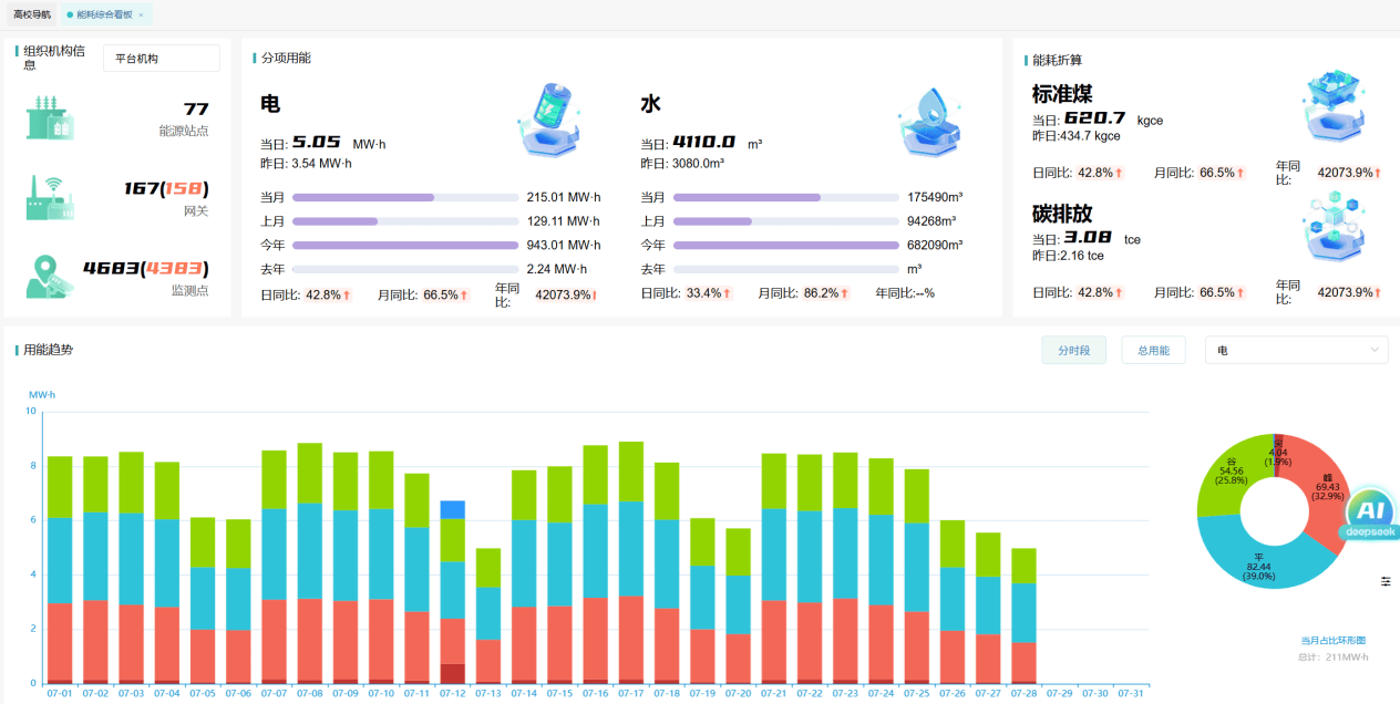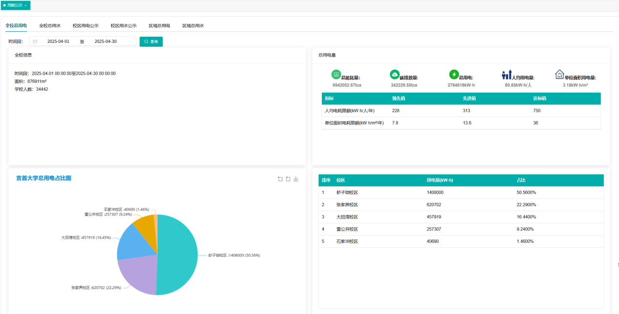 让能源使用“看得见、说得清”。通过可视化图表与定期能效报告,公开各楼宇、院系的能耗数据、排名及趋势变化。不仅提升管理透明度,更有效激发师生节能意识,营造“人人关注能耗、全员参与节能”的绿色校园文化氛围。