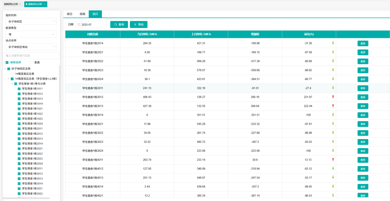 按需分析,科学对标。支持自定义建筑或部门分组,横向对比各建筑单位面积能耗,统计各院系月度总用量,助力精细化管理决策。
